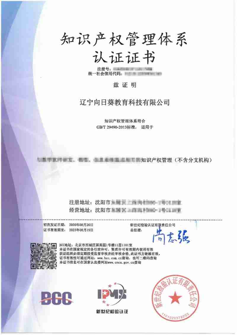 近日,向日葵教育科技順利通過知識產(chǎn)權(quán)管理體系認證審核,喜獲由新世紀檢驗認證有限責任公司(簡稱BCC)頒發(fā)的知識產(chǎn)權(quán)管理體系認證證書。