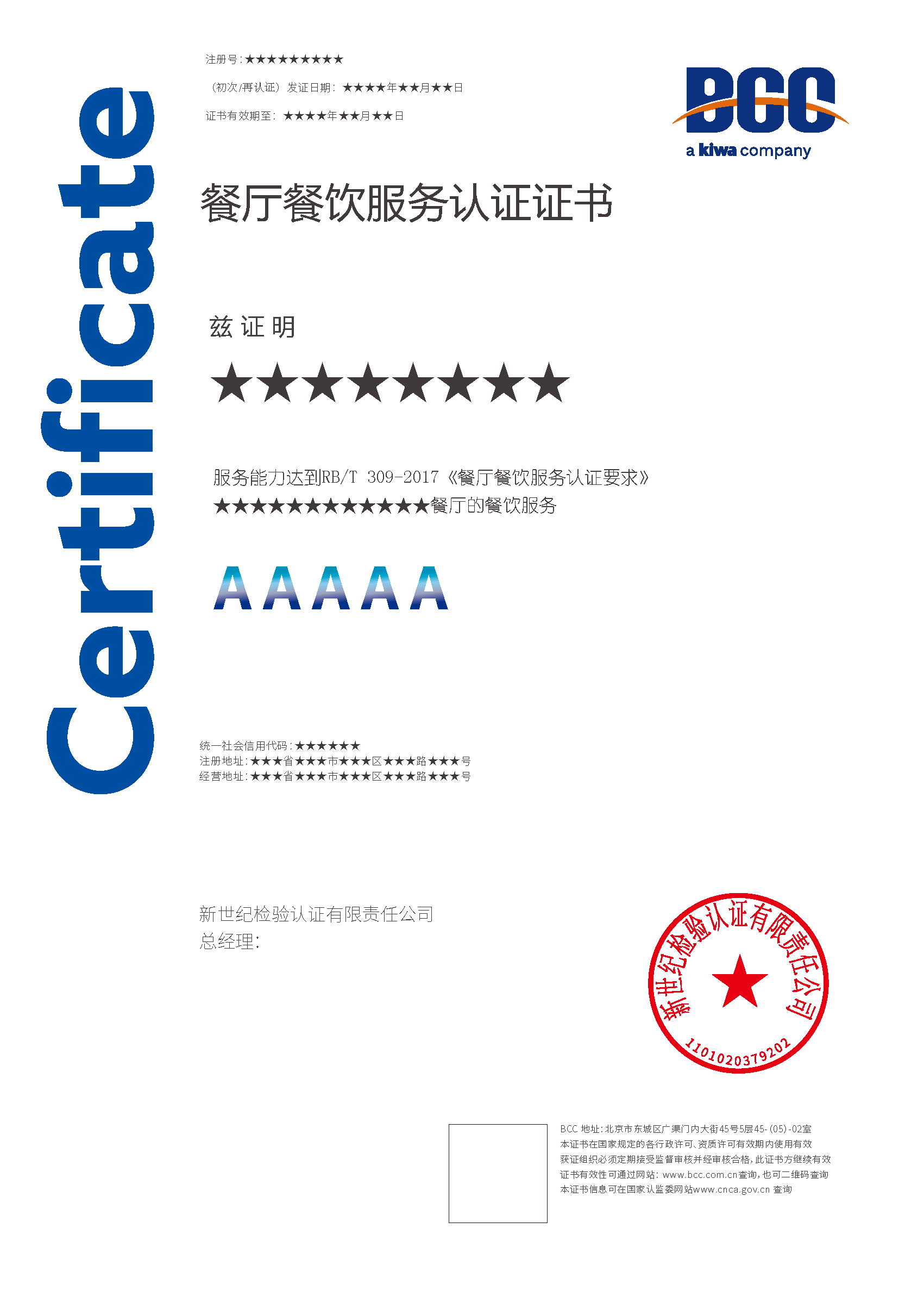 餐廳餐飲服務(wù)認(rèn)證的證書(shū)有效期為三年,每年BCC會(huì)對(duì)獲證組織進(jìn)行必要的監(jiān)督審查,證書(shū)到期前還要實(shí)施再認(rèn)證審查。