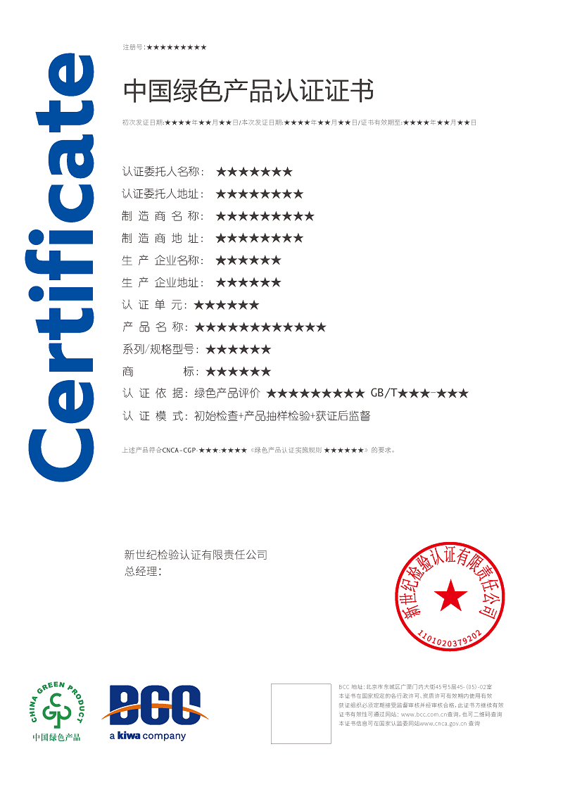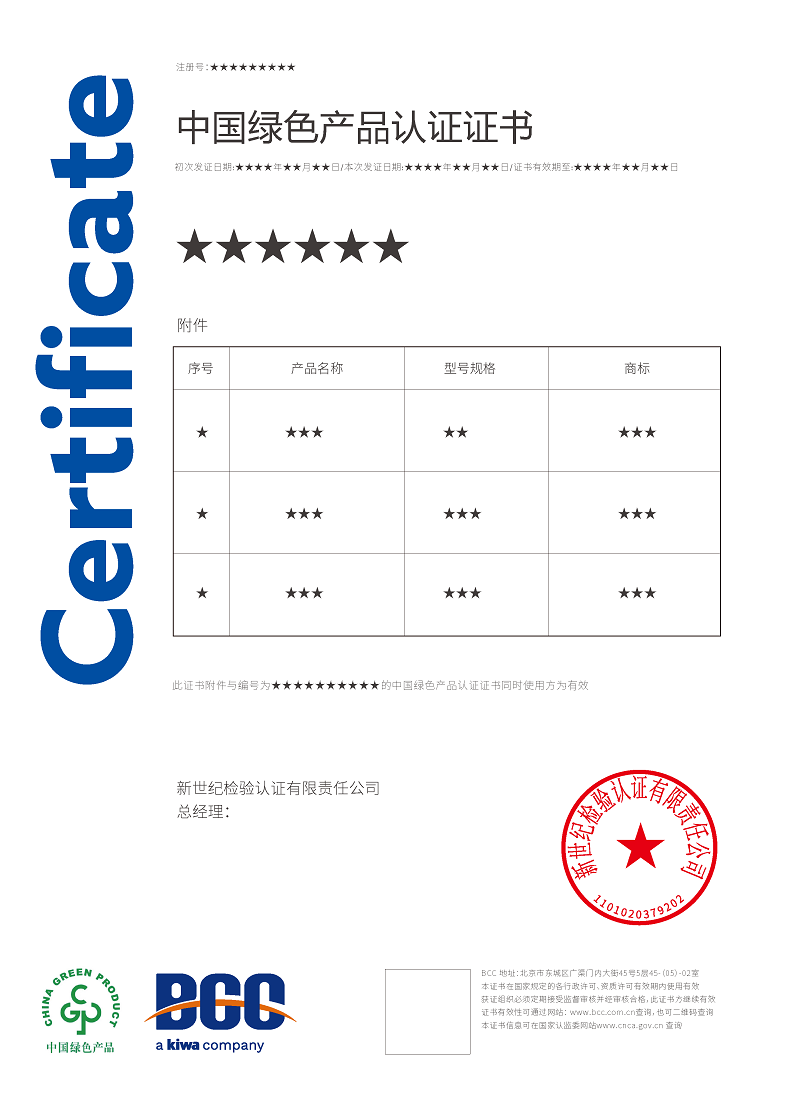 目前,BCC已順利通過(guò)國(guó)家認(rèn)證認(rèn)可監(jiān)督管理委員會(huì)(CNCA)審批,獲得了多項(xiàng)綠色產(chǎn)品認(rèn)證資質(zhì),包括: