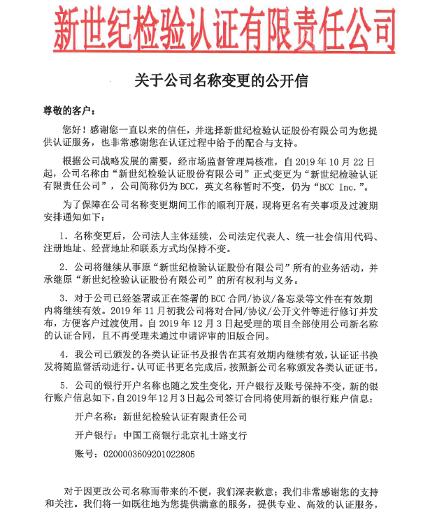 根據(jù)公司戰(zhàn)略發(fā)展的需要,經(jīng)市場監(jiān)督管理局核準(zhǔn),自2019年10月22日起,公司名稱由“新世紀(jì)檢驗(yàn)認(rèn)證股份有限公司”正式變更為“新世紀(jì)檢驗(yàn)認(rèn)證有限責(zé)任公司”,公司簡稱仍為BCC,英文名稱暫時(shí)不變,仍為“BCC Inc.”。