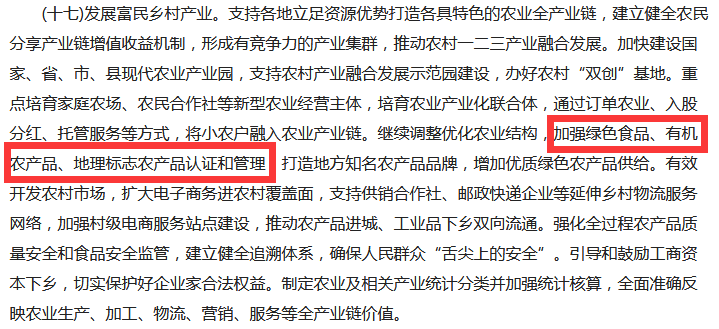 文件中的第十七點,提到了“加強(qiáng)綠色食品、有機(jī)農(nóng)產(chǎn)品認(rèn)證和管理”