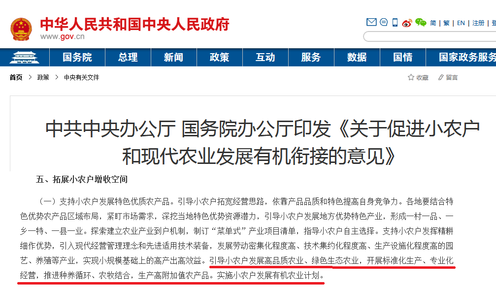 其中意見描述:“引導(dǎo)小農(nóng)戶發(fā)展高品質(zhì)農(nóng)業(yè)、綠色生態(tài)農(nóng)業(yè),開展標(biāo)準(zhǔn)化生產(chǎn)、專業(yè)化經(jīng)營,推進(jìn)種養(yǎng)循環(huán)、農(nóng)牧結(jié)合,生產(chǎn)高附加值農(nóng)產(chǎn)品。實施小農(nóng)戶發(fā)展有機(jī)農(nóng)業(yè)計劃。”