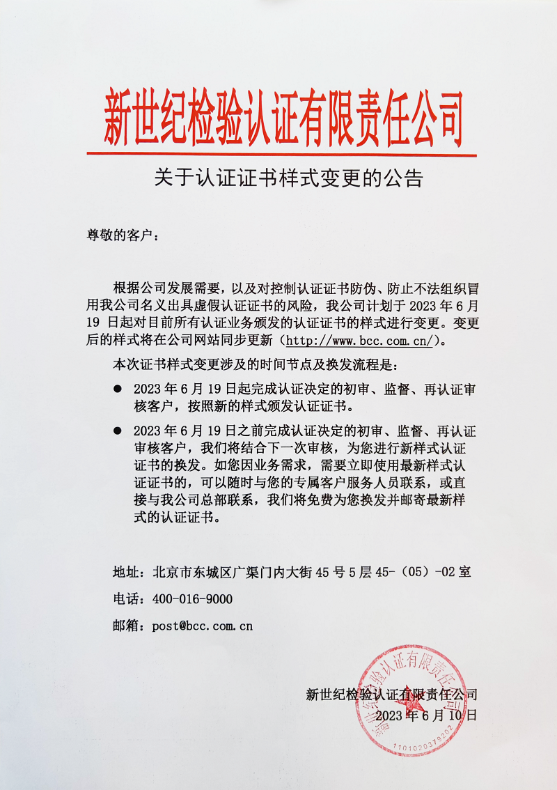 關(guān)于認(rèn)證證書樣式變更的公告