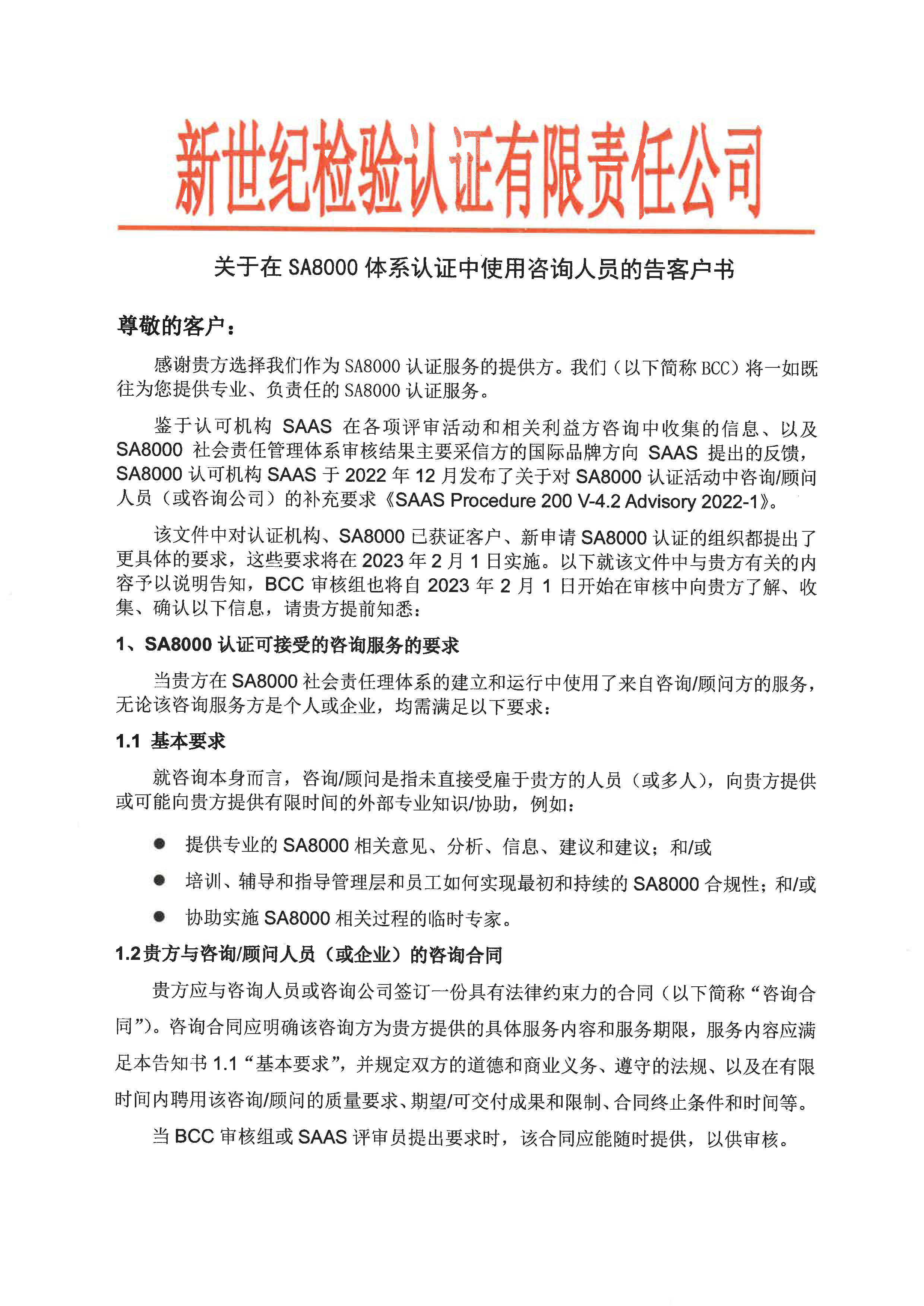 關(guān)于在SA8000體系認證中使用咨詢?nèi)藛T的告客戶書