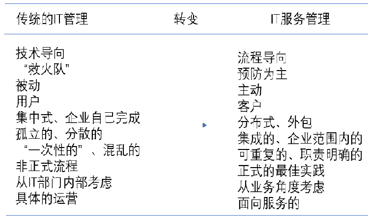 根本出發(fā)點(diǎn)在于通過 IT 服務(wù)有力的支持企業(yè)的發(fā)展以及業(yè)務(wù)部門業(yè)務(wù)的開展,促進(jìn)企業(yè)競爭力的有效提升。在 IT 管理當(dāng)中,IT 服務(wù)管理屬于不可或缺的構(gòu)成部分。但是IT 服務(wù)管理有別于傳統(tǒng)的 IT 管理,其存在的意義在于將基于服務(wù)之上的 IT 管理提供給購買 IT 服務(wù)的企業(yè)或內(nèi)部部門。