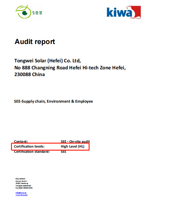 作為全球認(rèn)證領(lǐng)域20強(qiáng)企業(yè),Kiwa集團(tuán)專家與Kiwa BCC專家對企業(yè)進(jìn)行了現(xiàn)場審核、通過員工訪談,以及文件評審等工作,最終為通威太陽能頒發(fā)了首份依據(jù)SEE標(biāo)準(zhǔn)的ESG現(xiàn)場評估報(bào)告,并高度評價(jià)了通威太陽能在ESG管理方面的突出表現(xiàn)。報(bào)告涵蓋可持續(xù)的企業(yè)治理、供應(yīng)鏈管理、員工權(quán)益、環(huán)境管理四個(gè)部分,總計(jì)約50個(gè)主題,在全球范圍內(nèi)有著較高且廣泛的客戶接受度和權(quán)威公信力。